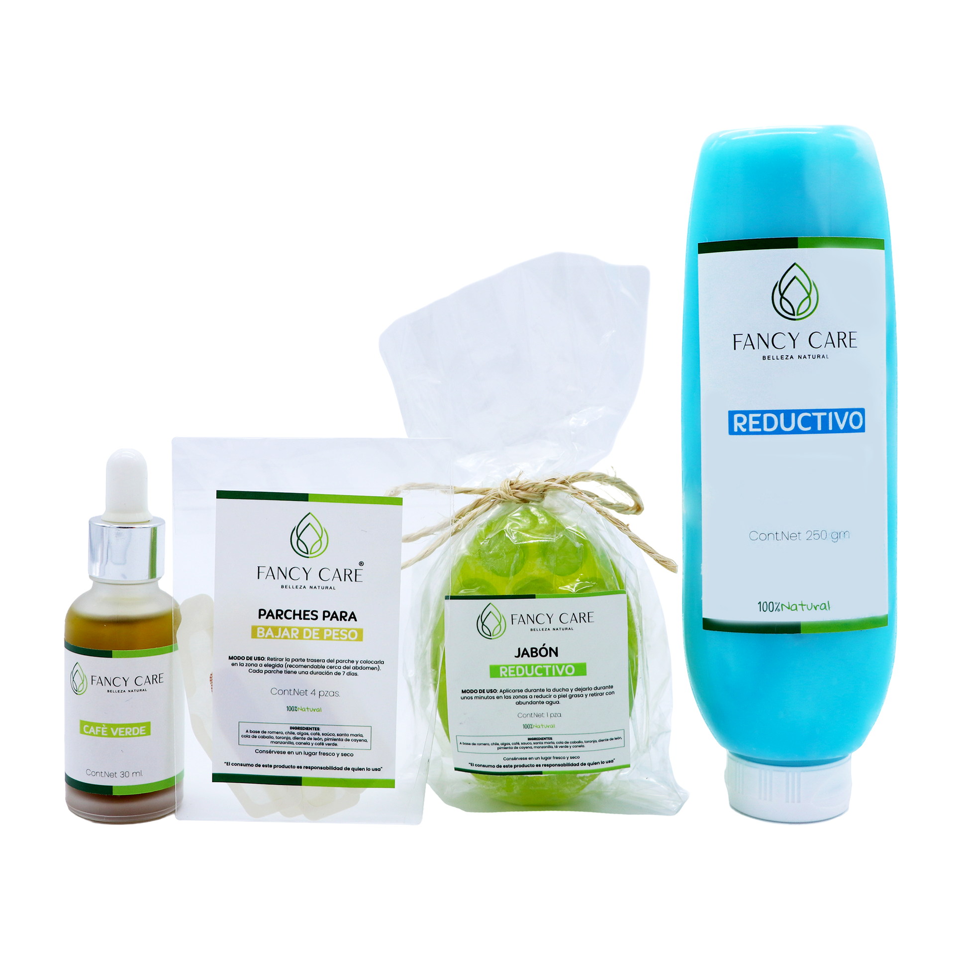 Contenido: Café verde, Parches para bajar de peso, Jabón reductivo, Gel reductivo.