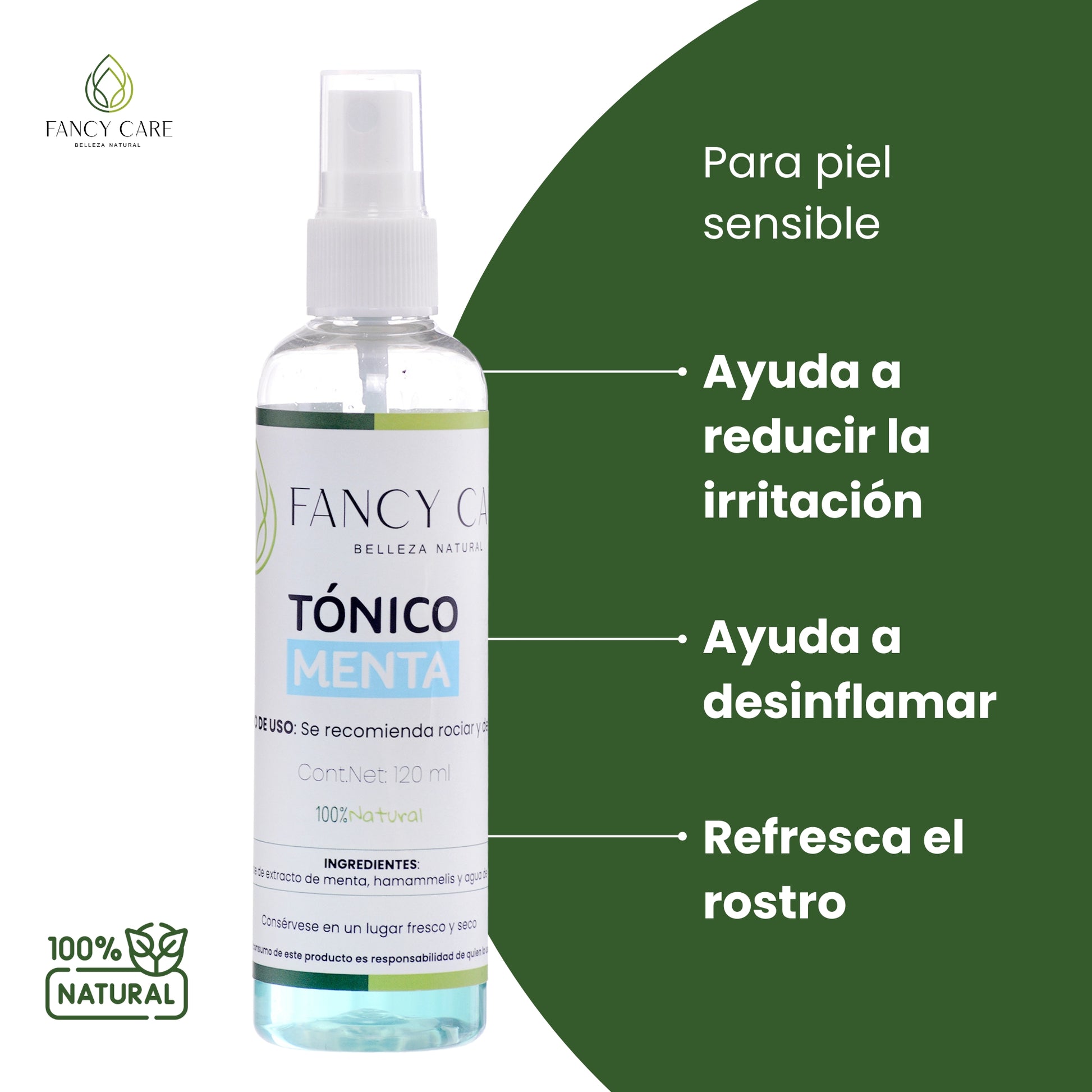 Ingredientes: Extracto de menta, extracto de verbena, hamamelis, y agua de rosas
